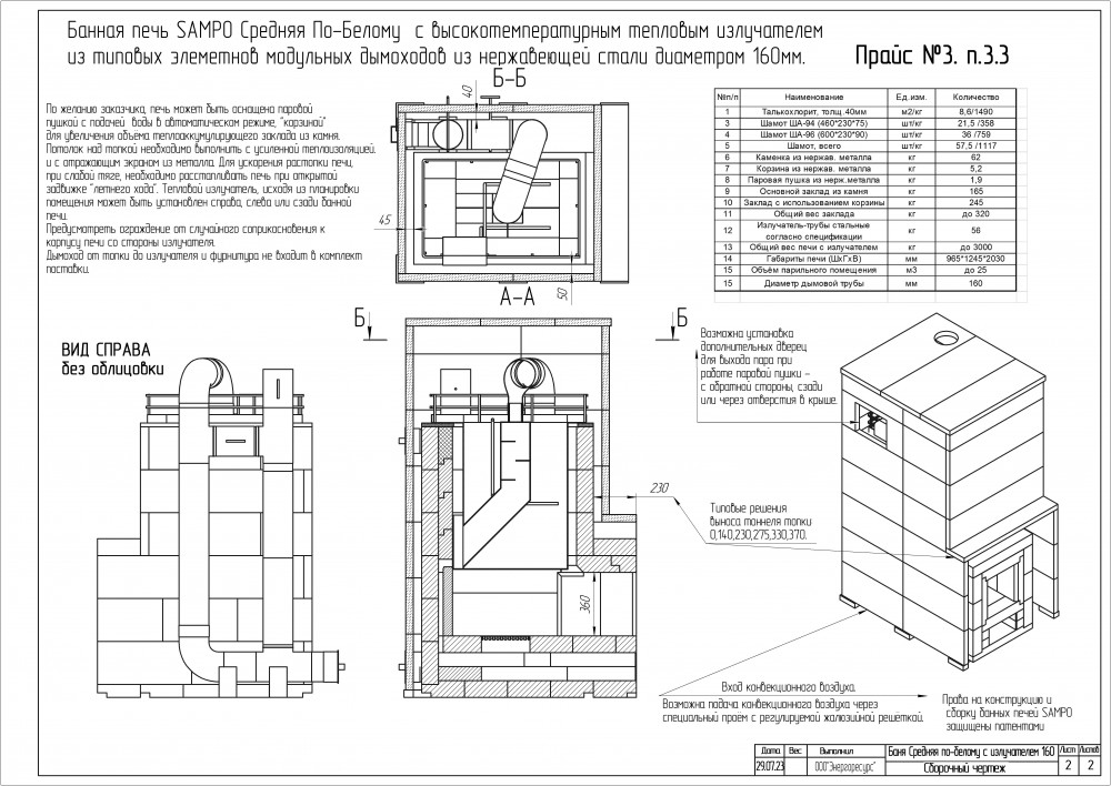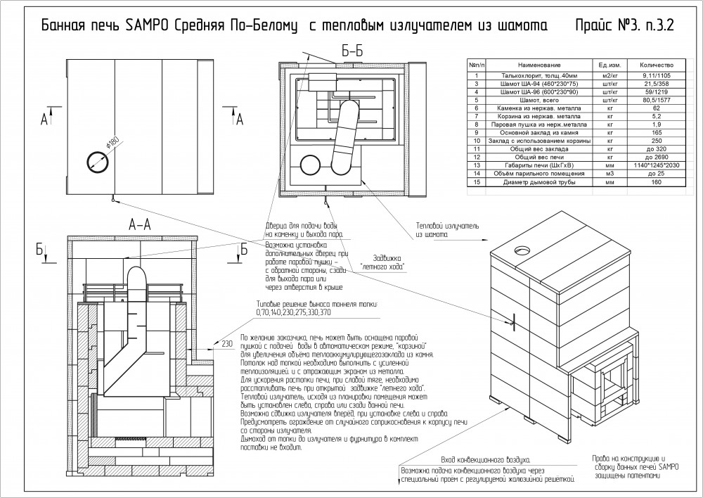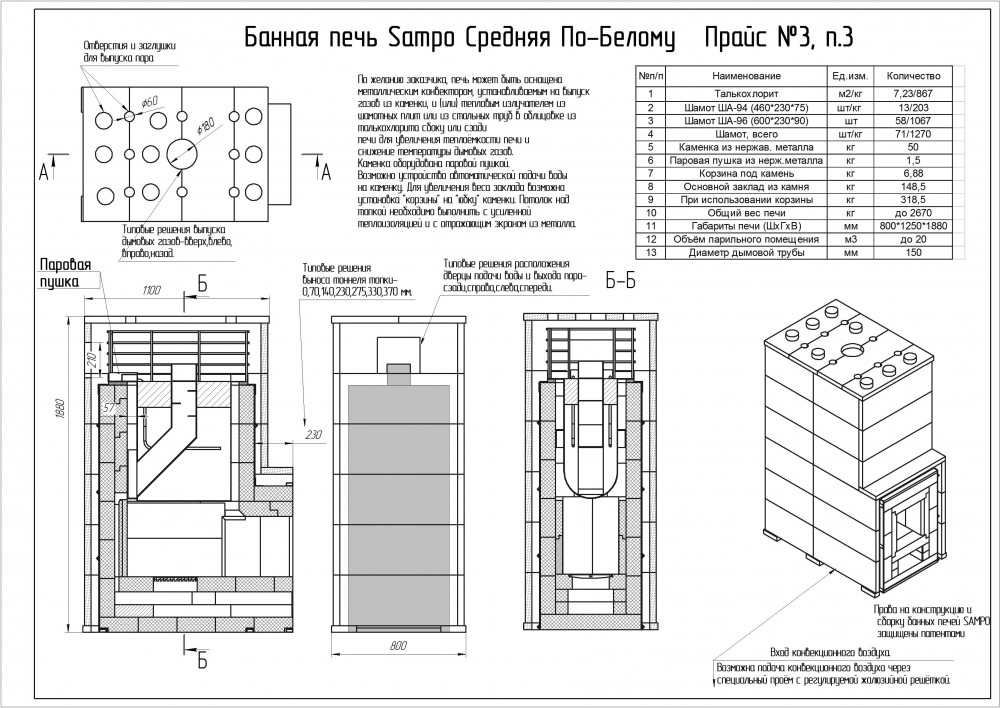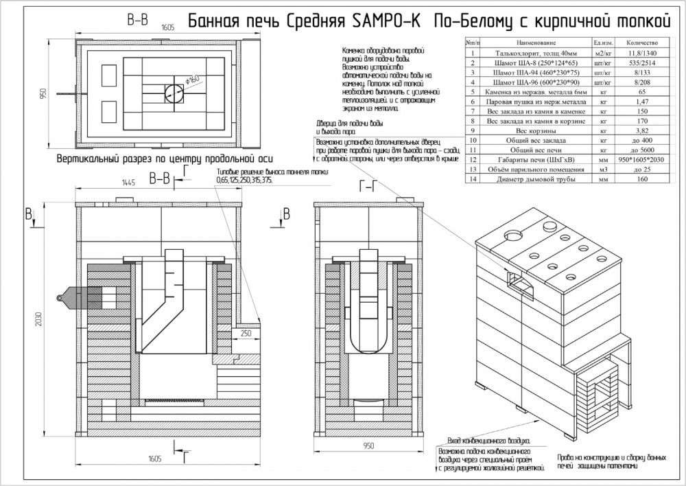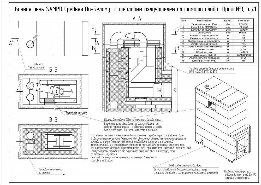*Стоимость покупаемого заказчиком шамотного кирпича на месте установки Печи составляет для SAMPO-K 79 500 руб, а для SAMPO-Кд 95 000 руб.