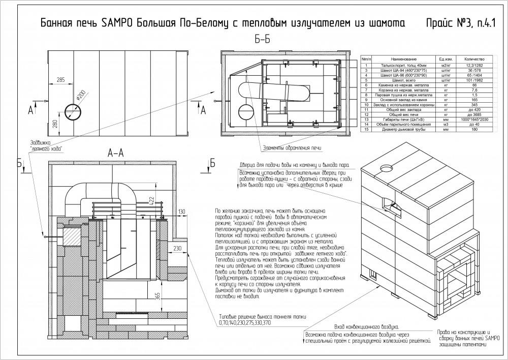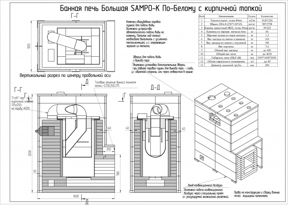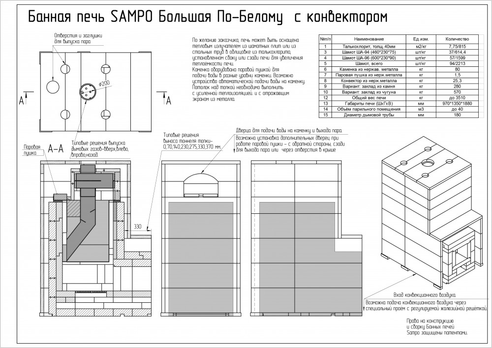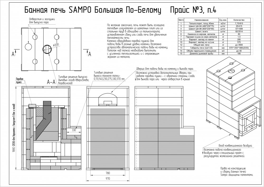 *Стоимость покупаемого заказчиком шамотного кирпича на месте установки Печи составляет для SAMPO-K 110 000 руб, а для SAMPO-Кд 125 000 руб.