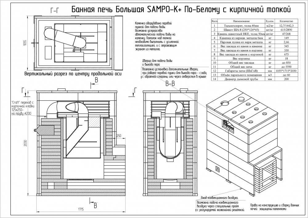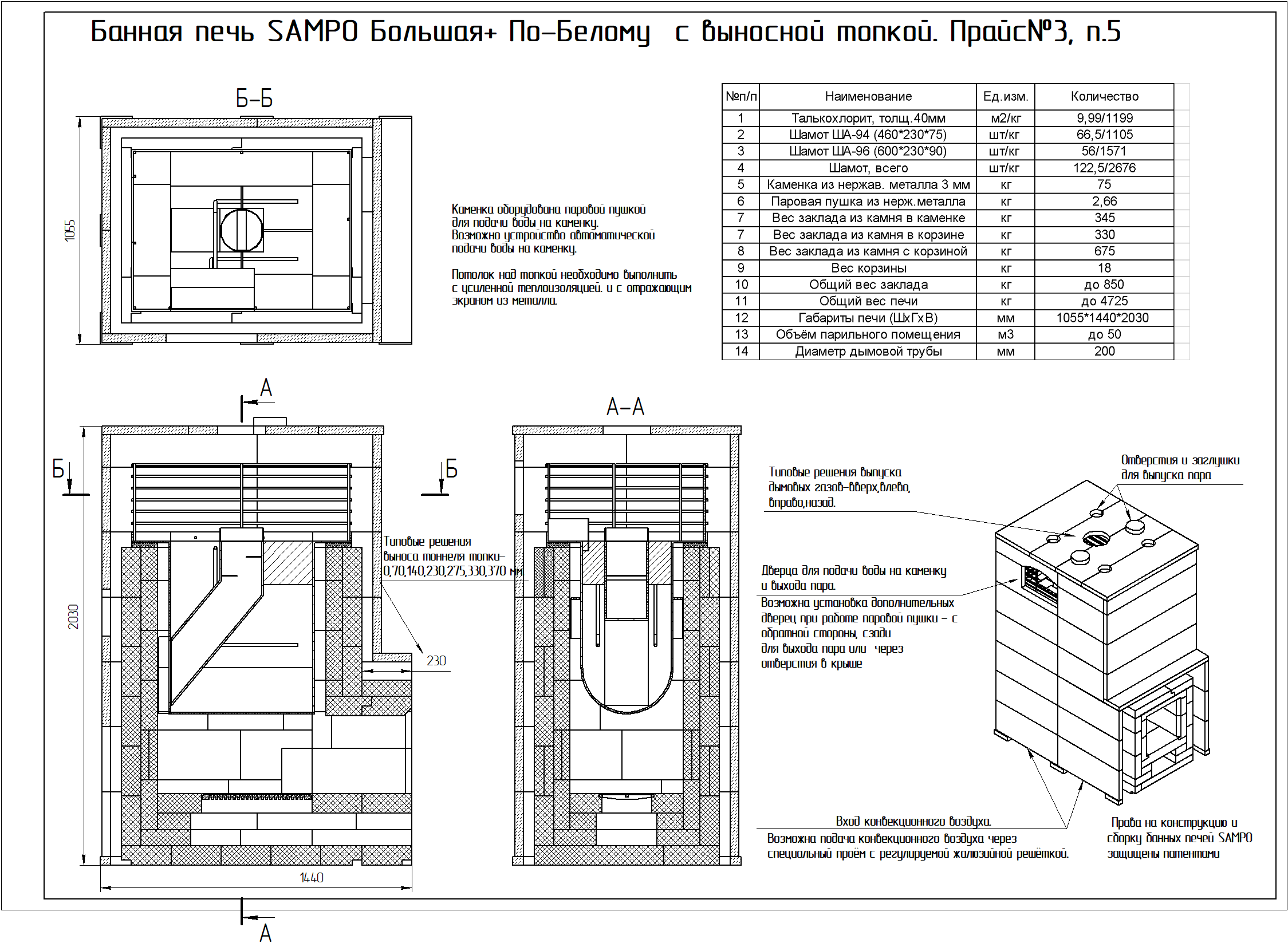 Характеристики Большой+ Печи SAMPO с Каменной выносной топкой для Бани по-Белому: