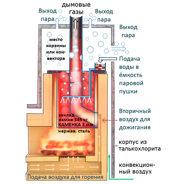 Для максимального объема парилки рекомендуется использовать совместно с печью: теплоизлучатели (дымооборот), конвекторы и заклад из нержавеющих цилиндров в нижней части каменки.