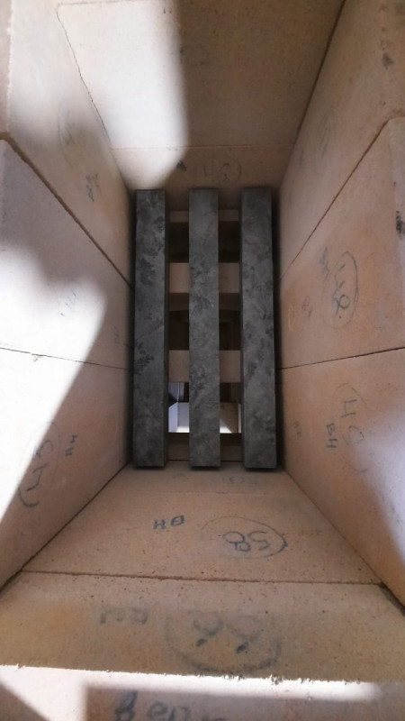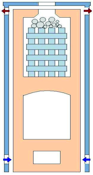 - Заклад из брусков размещают в виде клети на перемычках из шамотных плит, часть заклада из колотых камней укладывается поверх Клети.