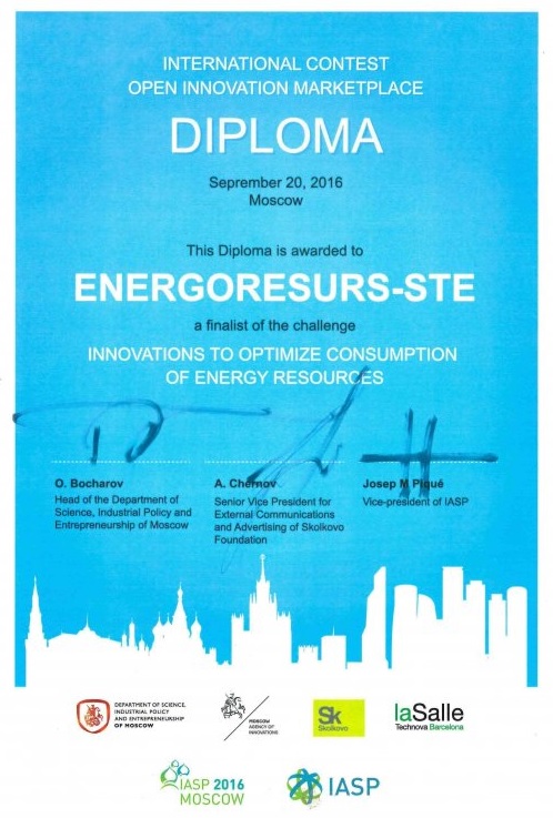19-22 сентября 2016 г. в г. Москва на 33-ей Всемирной конференции IASP (всемирная сеть научных парков и зон инновационного развития) проходил международный конкурс по отбору 50 лучших стартапов Open Innovation Marketplace (OIMP). ООО ЭНЕРГОРЕСУРС стал финалистом конкурса OIMP (направление: «ЭНЕРГЕТИКА») по теме: «Выравнивание суточной электрической нагрузки энергосистемы города». |