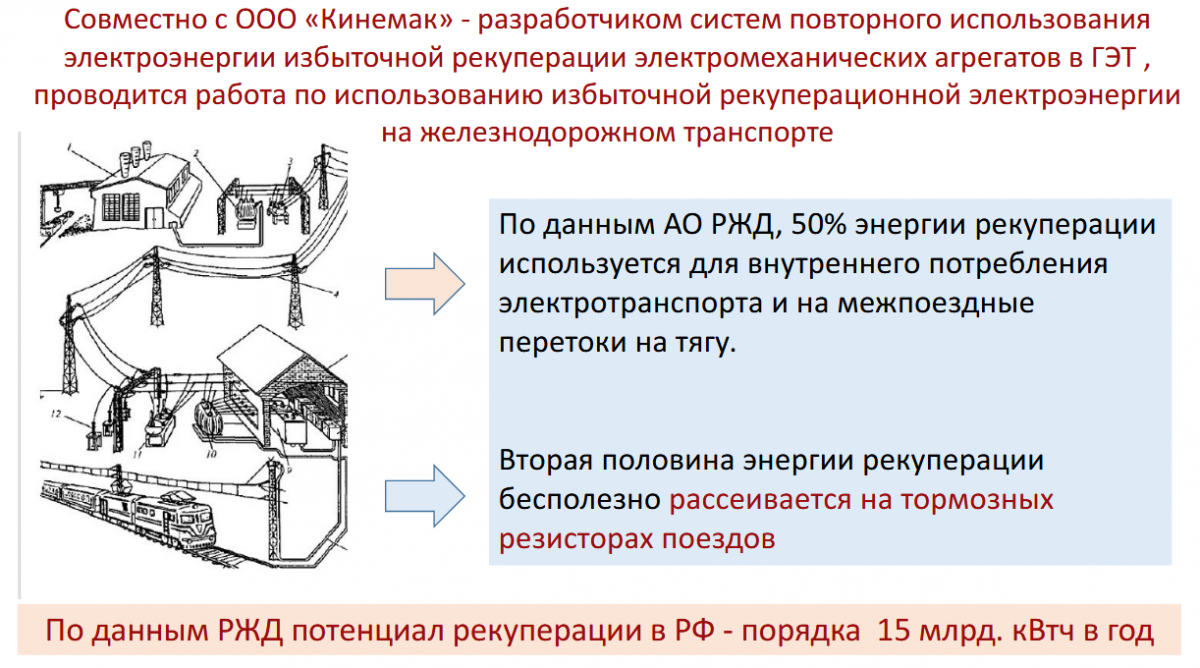 Совместно с ООО «Кинемак» - разработчиком систем повторного использования электроэнергии избыточной рекуперации электромеханических агрегатов в ГЭТ, проводится работа по использованию избыточной рекуперационной электроэнергии на железнодорожном транспорте |